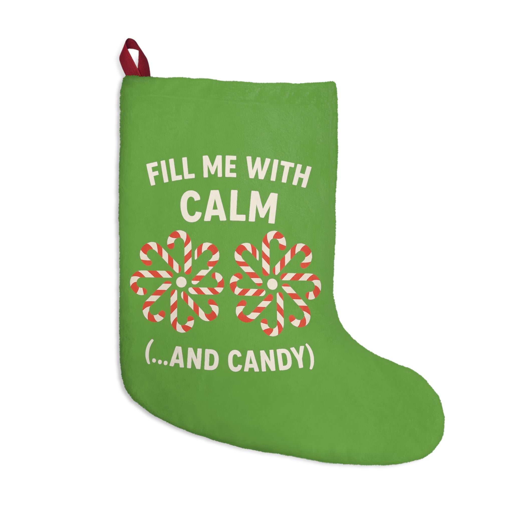 Bring warmth, humor, and a touch of calm to your holiday season with these cozy “Fill Me With Calm (...and Candy)” Christmas Stockings, available in both classic red and vibrant green.