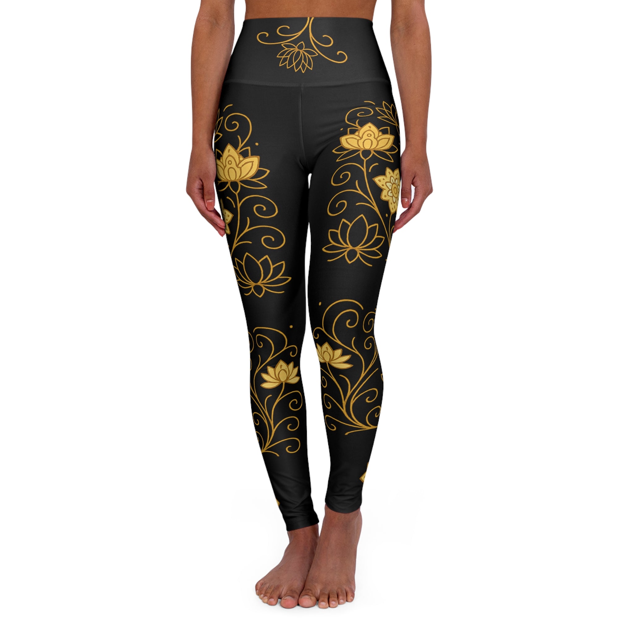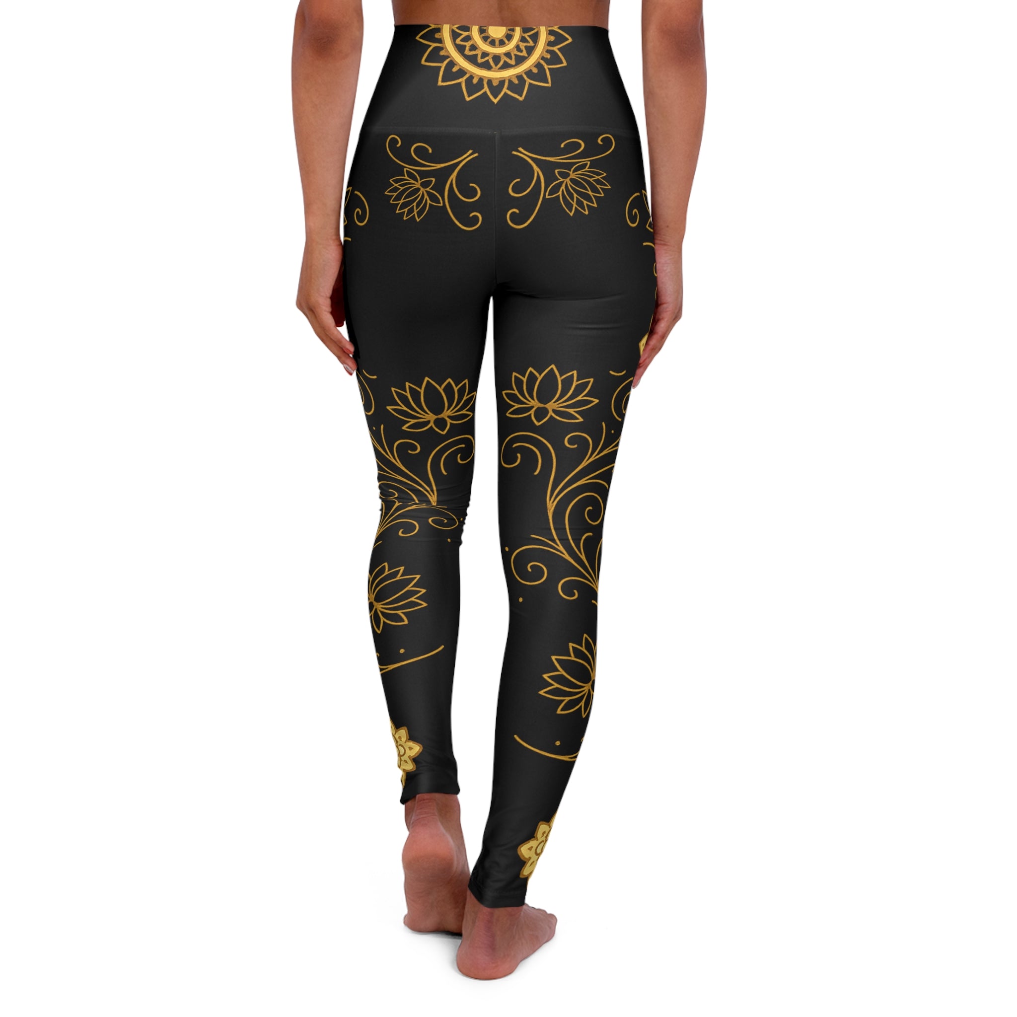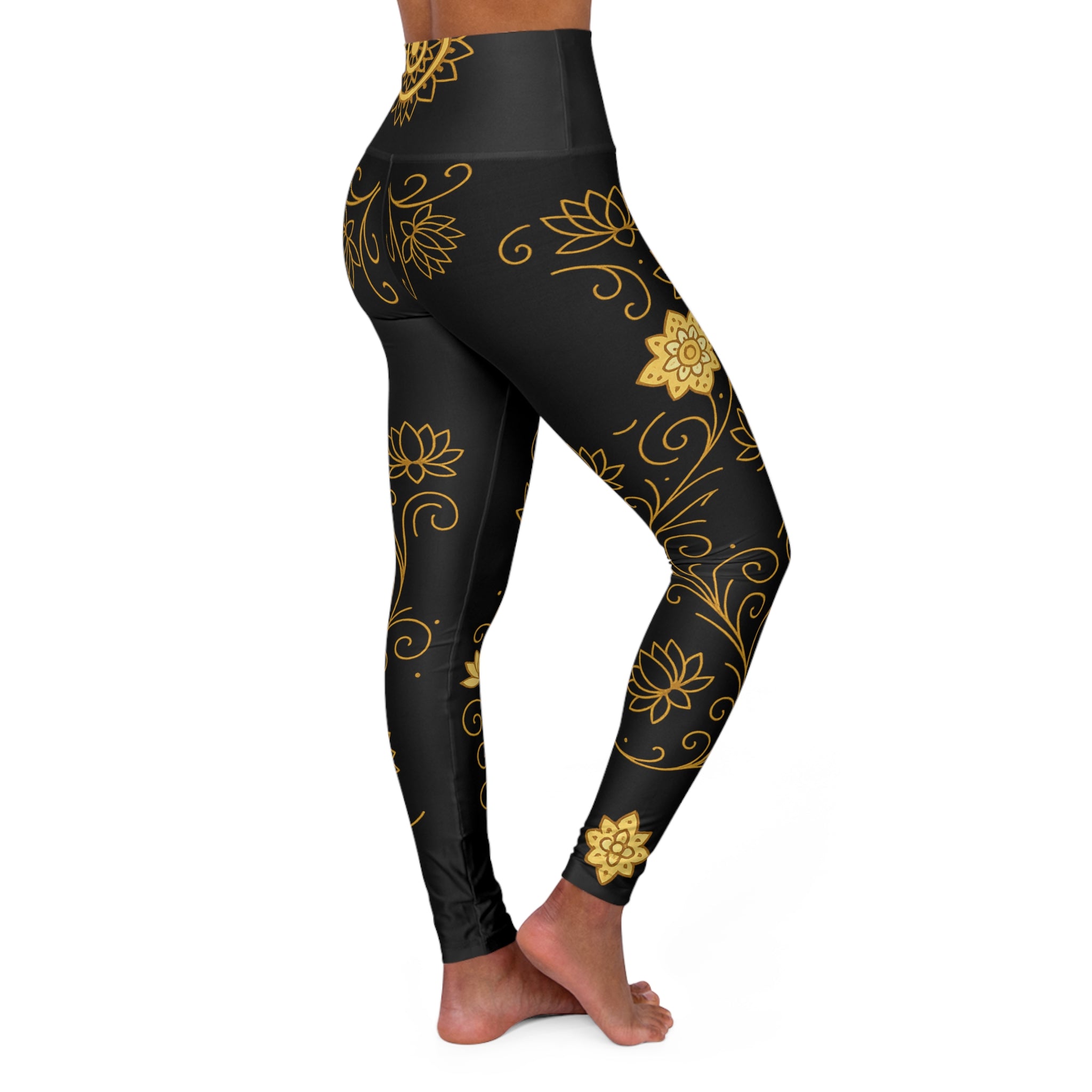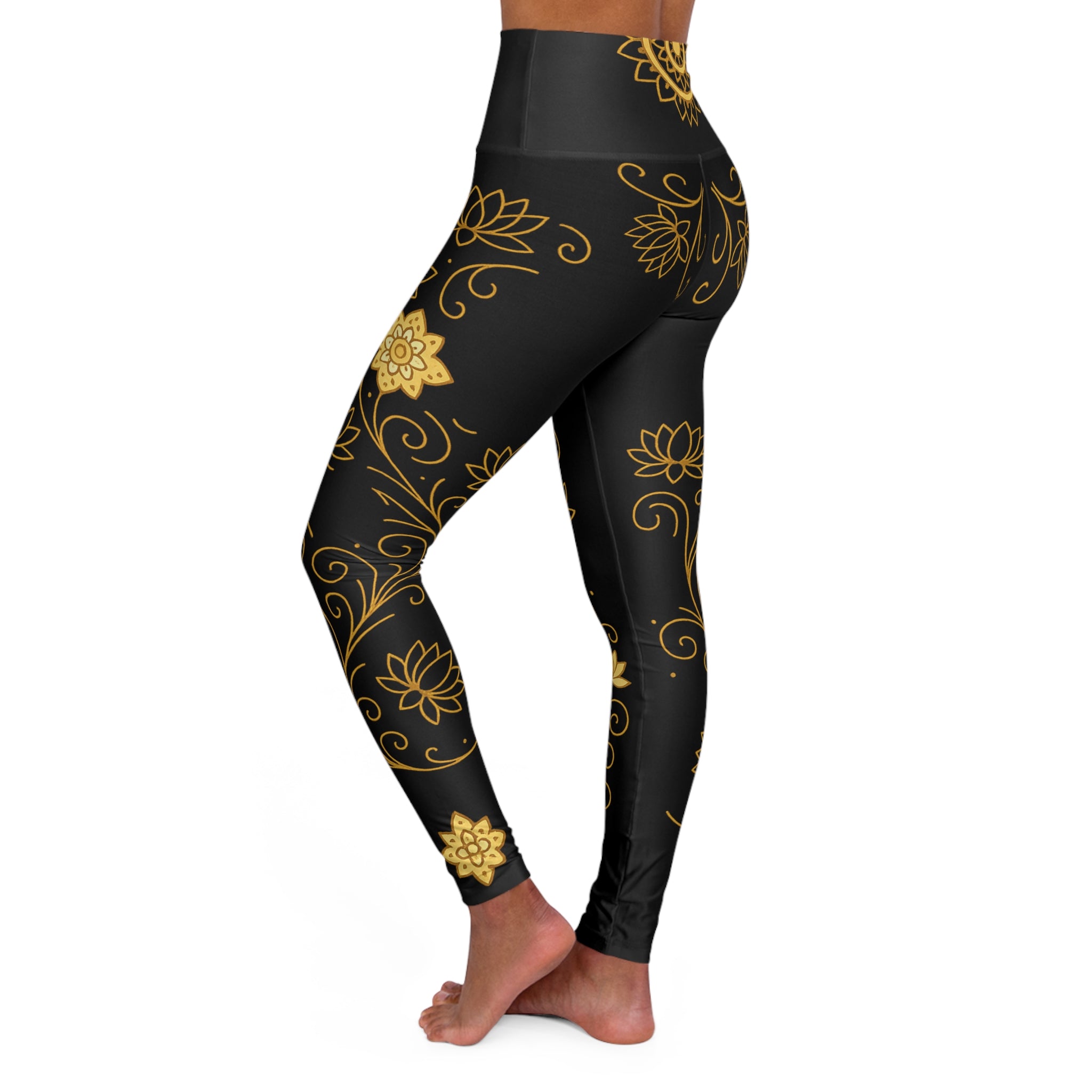 Elegant Black Yoga Leggings | Gold Floral Lotus Mandala Design
